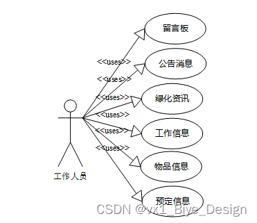 系统设计的目的是分析系统包括的所有功能结构,为开发人员设计开发和实现系统做好准备工作。经过前期的需求调查、分析和整理之后,确定的总体需求主要包括多个模块,分别是:公共管理(轮播图,公告消息),用户管理(管理员,工作人员),信息管理(留言板,留言分类,绿化资讯,资讯分类),工作信息,工作预定,工作提交,物品信息,物品预定)等。系统整体角色分为两个部分,一是工作人员、二是管理员。权限分布也是很明显,工作人员是在除去浏览信息之外还具有查询和管理自己账户信息,工作信息,物品信息,工作预定,工作提交,物品预定,清点记录等权限;管理员是最高权限拥有者。