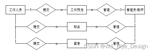 工作人员和工作信息存在申请关系,关系为一对多,根据工作编号来将工作数据传入到预定数据中,操作人为工作人员,然后生成预定列表,工作人员查看个人历史领取列表,可以进行数据销毁。