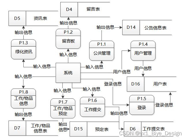 二层数据流程是对一层数据流层图中填写登录信息、用户功能的细化。即:用户管理,信息管理,工作信息,工作预定,工作提交,物品信息,物品预定,清点记录查询等操作。