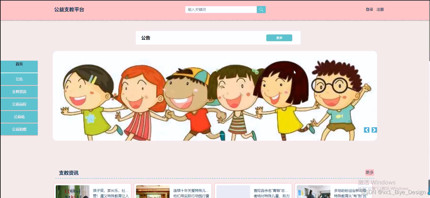 (2)查看公益支教平台的首页信息:公益支教平台的首页信息包含了首页、留规格、支教资讯、公益岗位、公益站、公益捐赠、我的(我的账户、我的收藏、个人中心)。