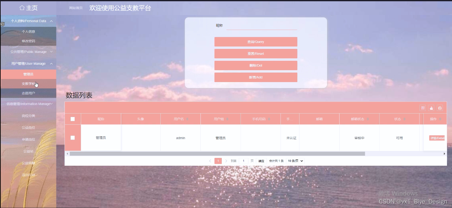 (2)用户管理:管理员可以对公益支教平台中的管理员以及前台注册的支教学校和志愿用户进行审核管理。