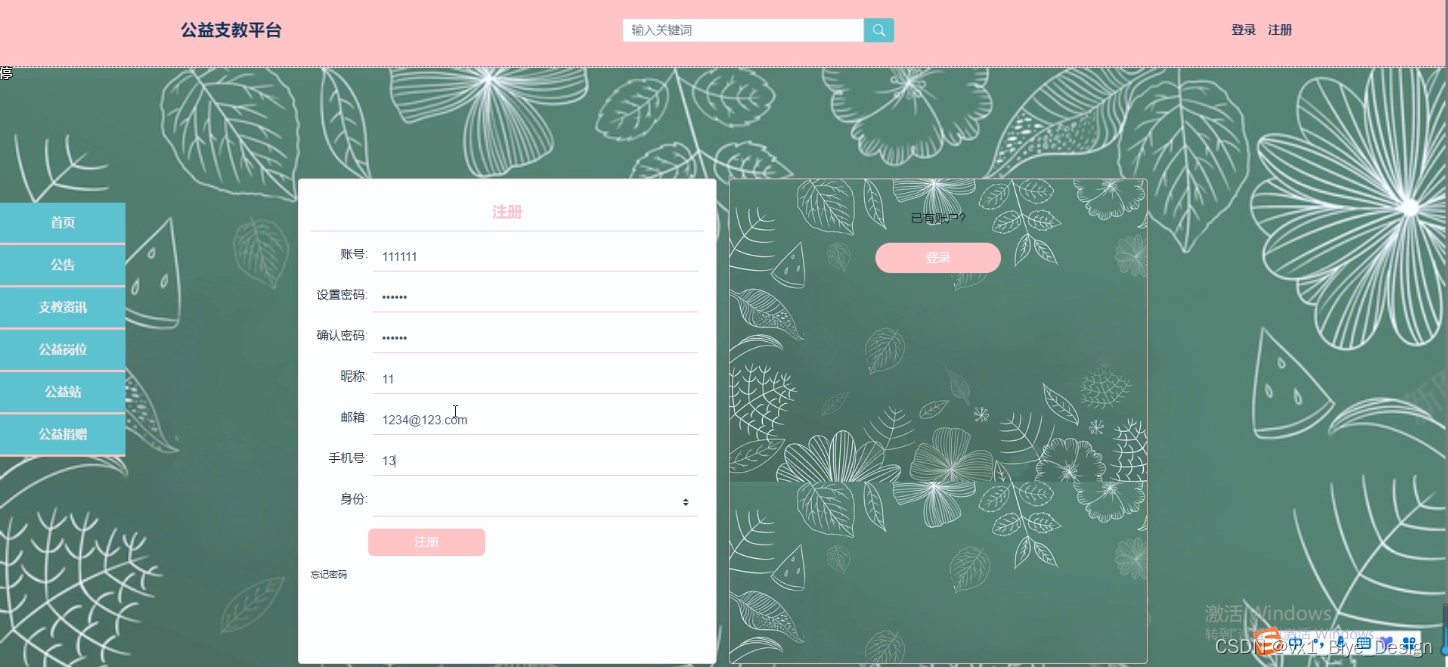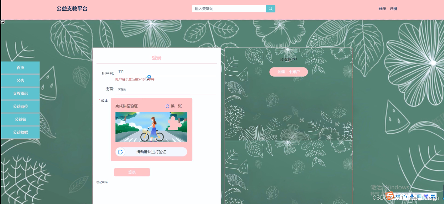(1)用户注册登录:游客可以随时进入到系统中,对系统中的信息浏览,但是想要实现公益岗位等操作,就必须有这个系统的账号,如果没有账号的话,可以注册以后进行相关的操作,同时用户还可以通过“我的账户”这以按钮对个人信息以及操作的信息进行管控。