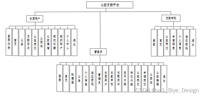 公益支教平台划分为了志愿用户模块、支教学校模块和管理员模块这三大部分。