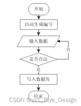 用户成功登入系统后就能够实现增加数据的操作,增加数据的编号是特定的,系统生成,用户不能随意填写,除了编号以外,其他增加信息用户自己填写,填写后的信息经过系统验证,验证合法通过就显示增加数据成功了,相反的话,就没有增加成功,图2-1显示的就是在增加数据时的流程。