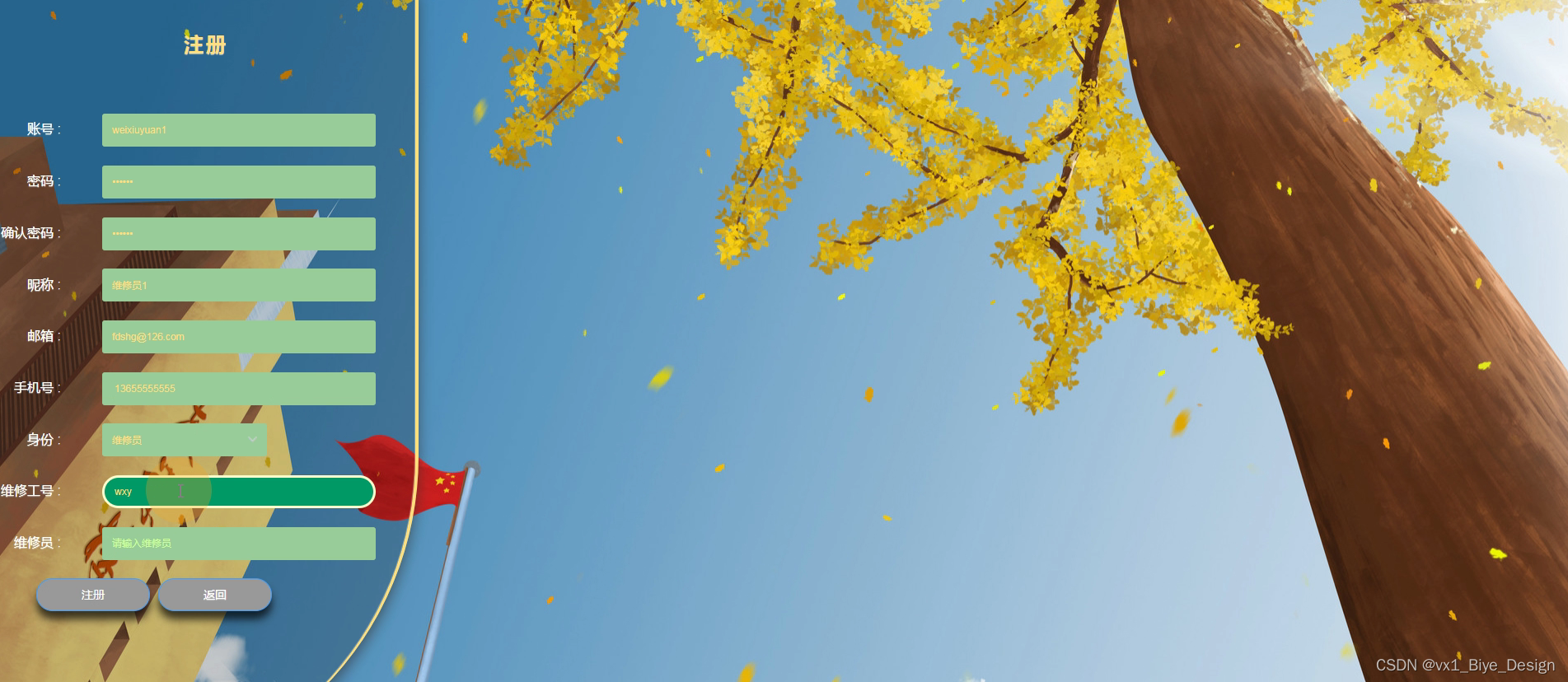 维修员注册,通过填写账号、密码、昵称等信息,输入完成后选择登录即可进入高校办公设备网上报修管理系统,如图5-13所示。