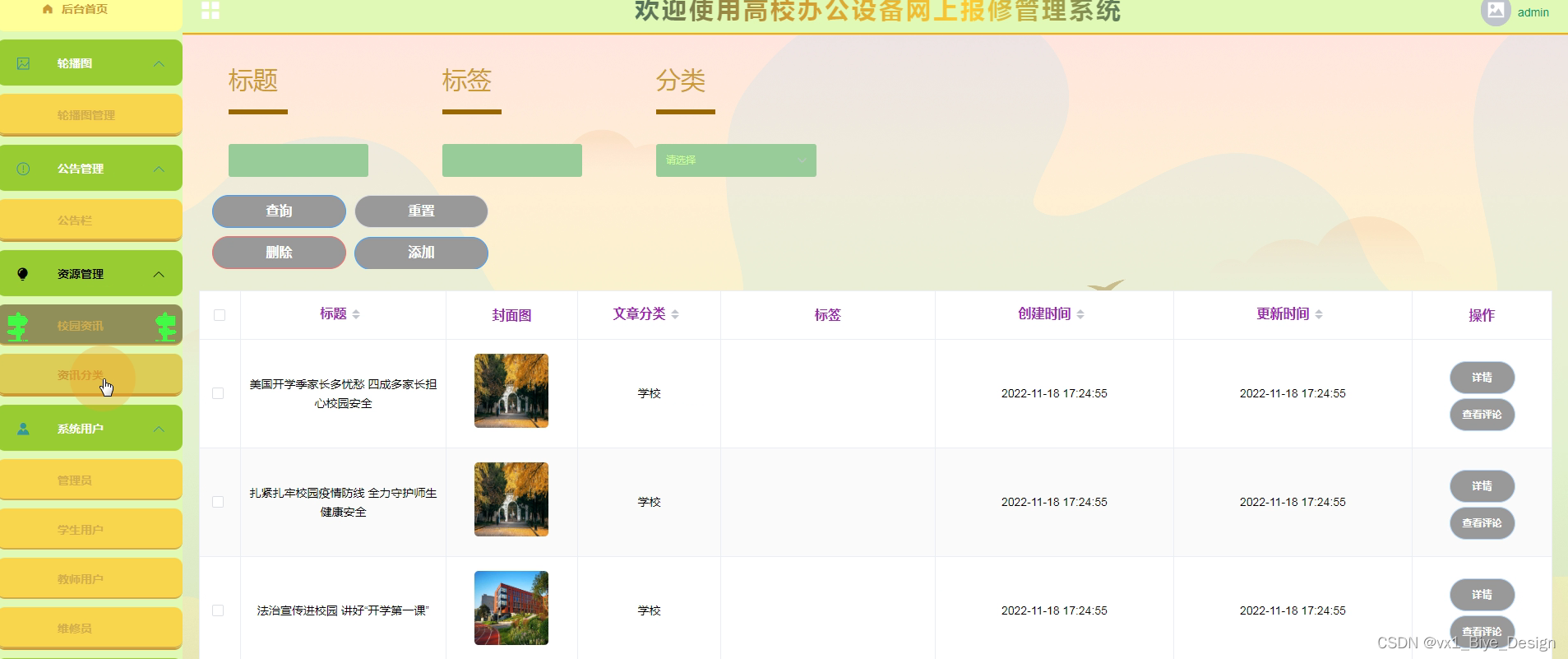校园资讯管理,在此管理页面可以校园资讯进行增删改等操作,如图5-6所示。