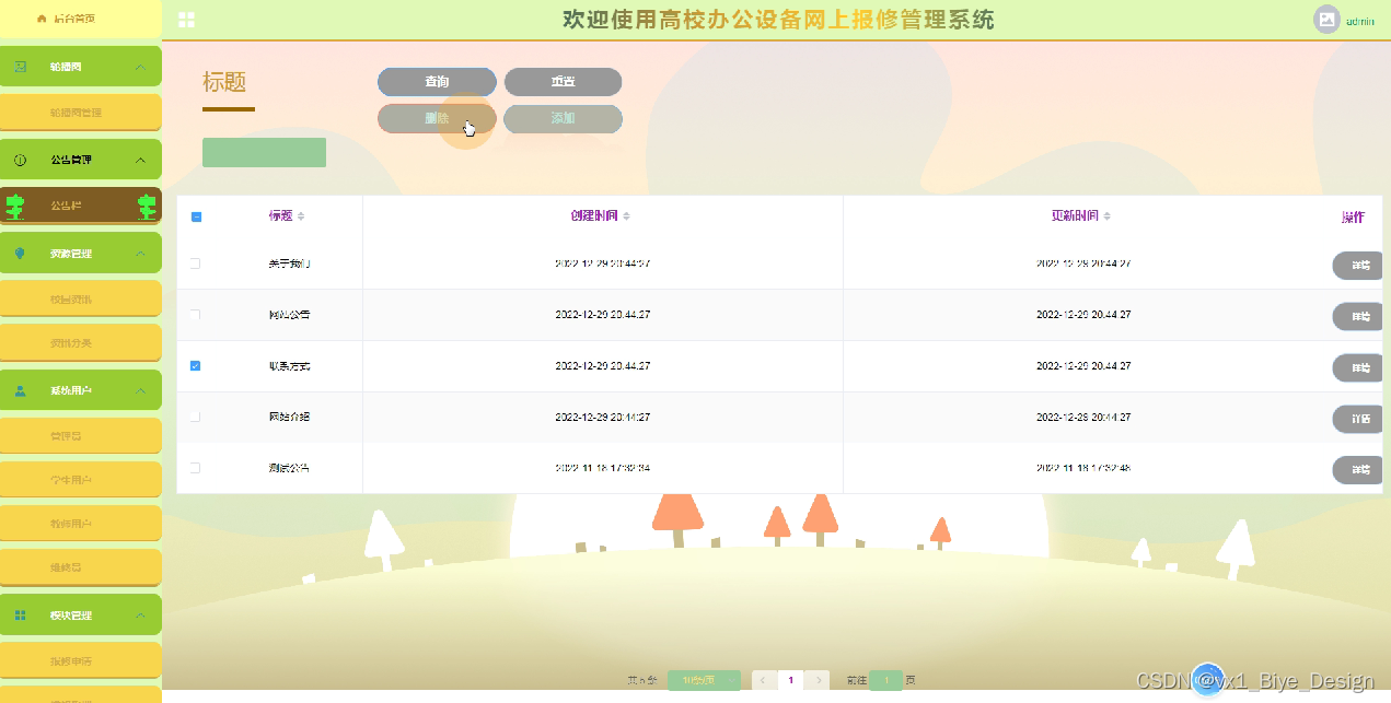 公告栏管理,在此管理页面可以公告栏信息进行增删改等操作,如图5-5所示。