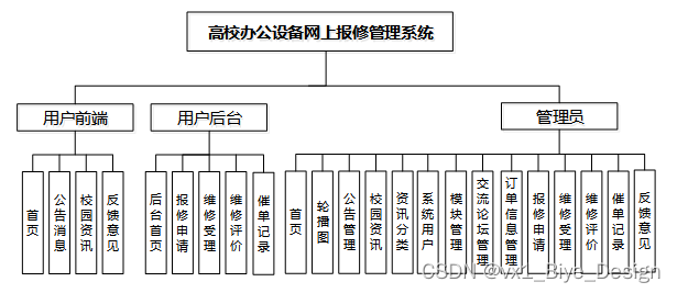(1)功能要求:可以管理首页,轮播图,公告管理,资源管理(校园资讯,资讯分类),系统用户(管理员,学生用户,教师用户,维修员),模块管理(报修申请,维修受理,维修评价,催单记录,反馈建议)等功能模块。