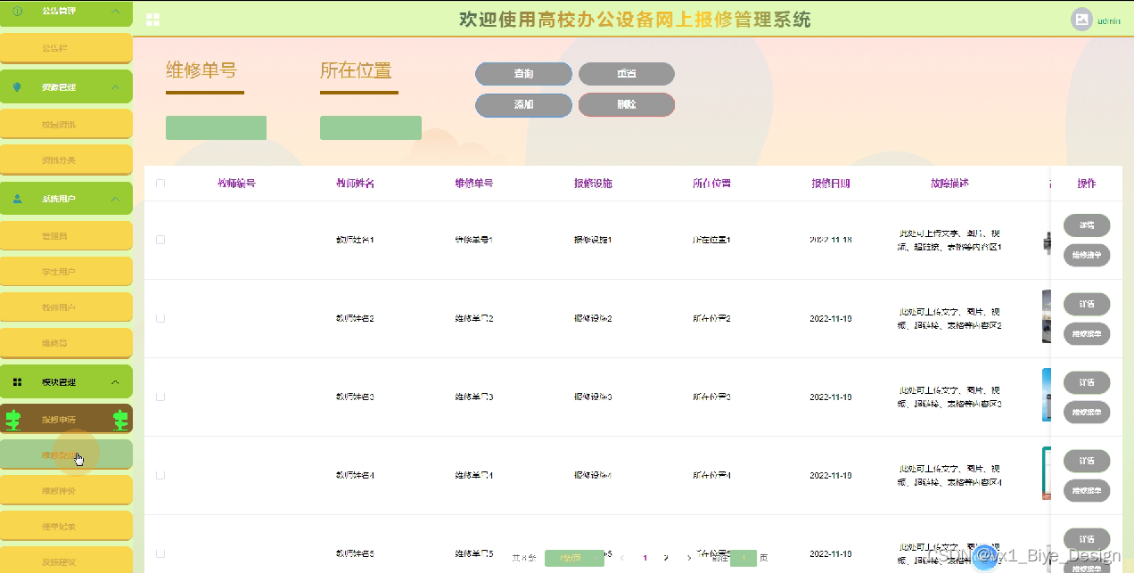 维修申请管理,在此页面可以查看教师和学生提交的维修单详情,并进行接单维修等操作,如图5-14所示。