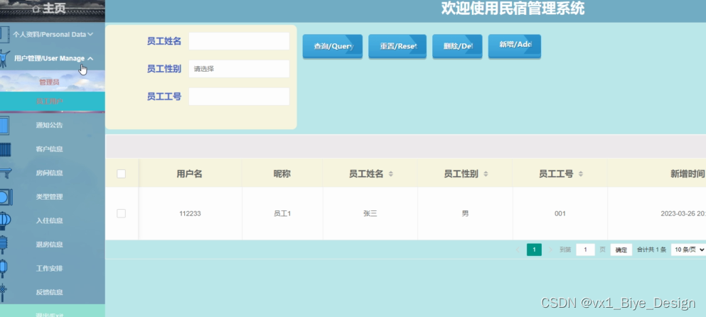 民宿管理系统中的管理员在“用户管理”这一菜单是中可以对注册的员工用户进行新增删除等管控。界面如下图4.9所示。