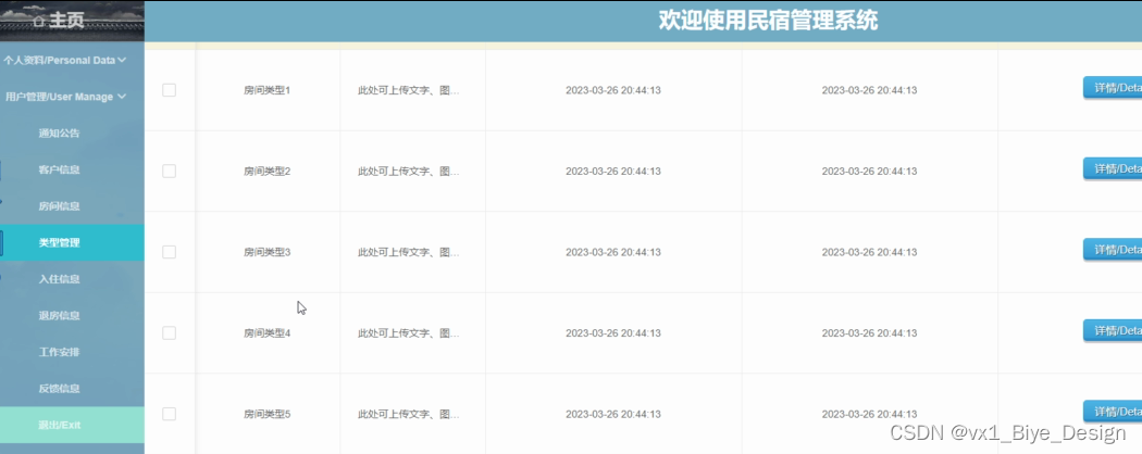 类型管理:管理员可以新增房间类型,更新时间,删除房间类型等操作。