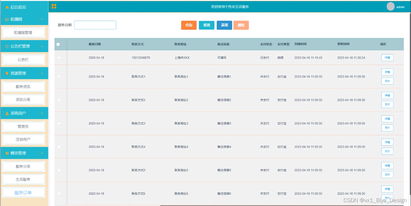 服务订单管理,在服务订单管理页面中可以对索引、服务日期、联系方式、联系地址、备注信息、支付状态、支付类型等信息进行详情支付、添加或删除等详细操作,如图5-15所示。