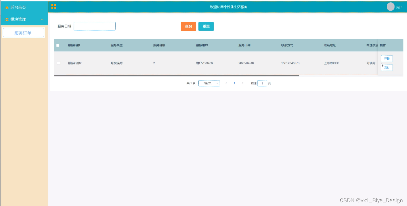 服务订单,在服务订单页面中通过填写服务名称、服务类型、服务价格、服务用户、服务日期、联系方式、联系地址、备注信息等信息,根据详情进行添加、查询、支付等操作,如图5-6所示。