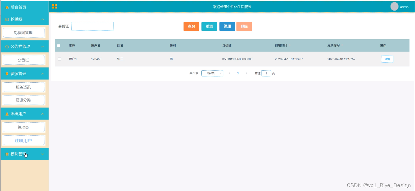 (1)功能要求:可以管理后台首页、轮播图(轮播图管理)、公告栏管理(公告栏)、资源管理(服务资讯、资讯分类)、系统用户(管理员、注册用户)、模块管理(服务分类、生活服务、服务订单)、个人中心等功能模块。