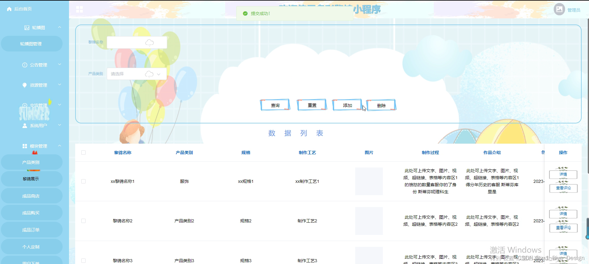 (2)黎锦展示管理:主要包括黎锦展示列表、品类管理、添加、黎锦信息管理等功能。