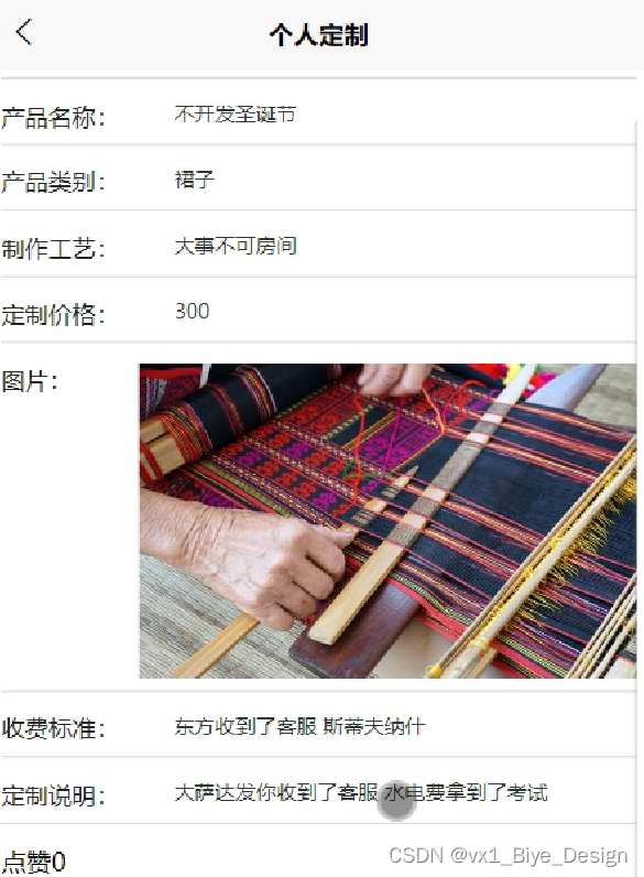 (4)个人订制管理:主要包括黎锦个人定制信息的展示,用户可以选择个人定制自己喜欢的黎锦产品。