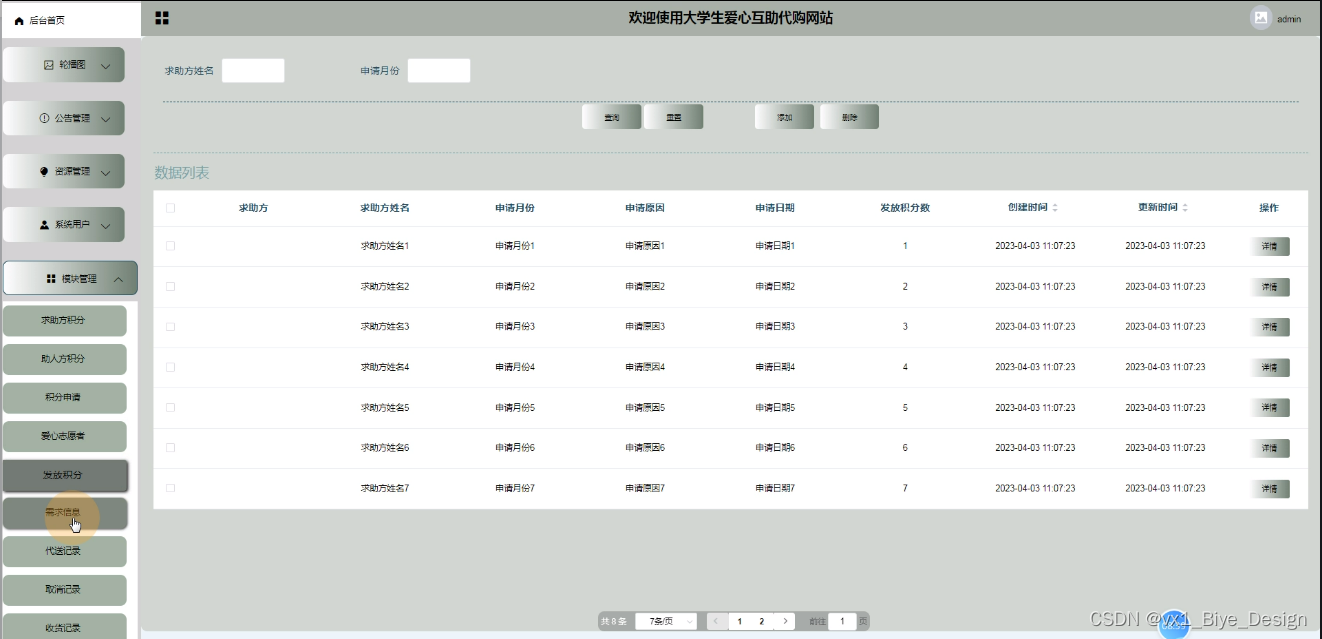 求助人进入到积分申请界面可以看到求助方、求助方姓名、申请月份、申请原因、申请日期、审核状态、审核回复等信息,还可在该页面进行查添加、修改等操作,活动有用户提出,社区人员再后台审核,如图5-11所示。