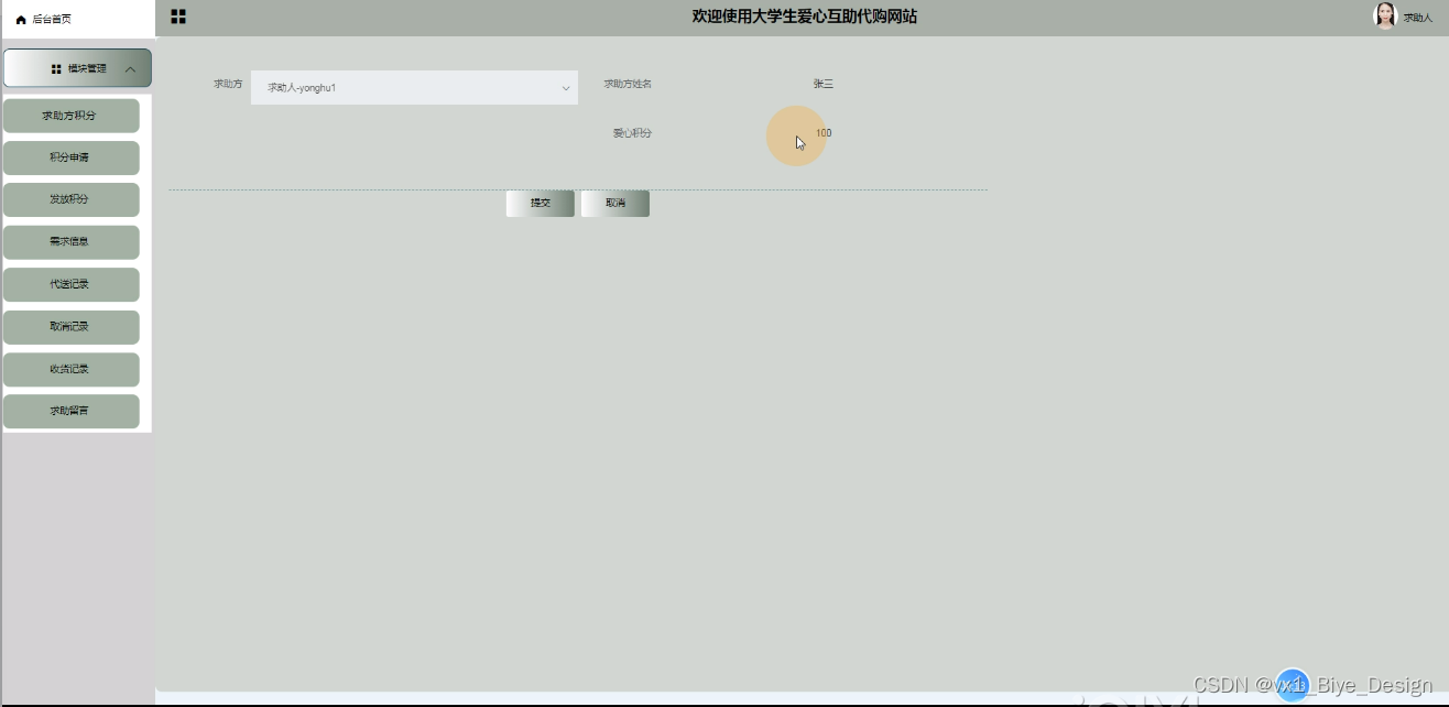 求助人进入到界面,通过界面的任务大厅,登录成功后进入到系统可以进行查看首页、模块管理(求助方积分、积分申请、发放积分、需求信息、代送记录、取消记录、收货记录、求助留言)等功能模块,进行相对应操作,如图5-9所示。