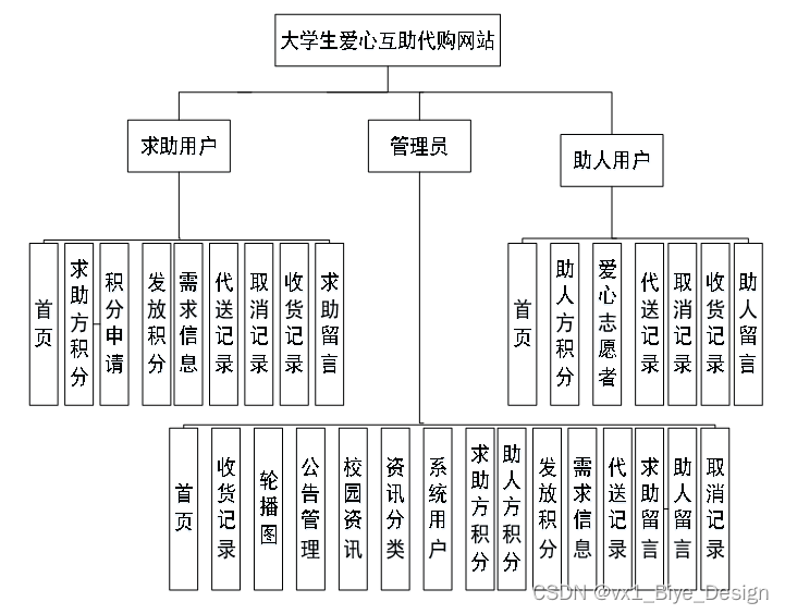 这些功能可以充分满足大学生爱心互助代购网站的需求。此系统功能较为全面如下图系统功能结构如图4-6所示。