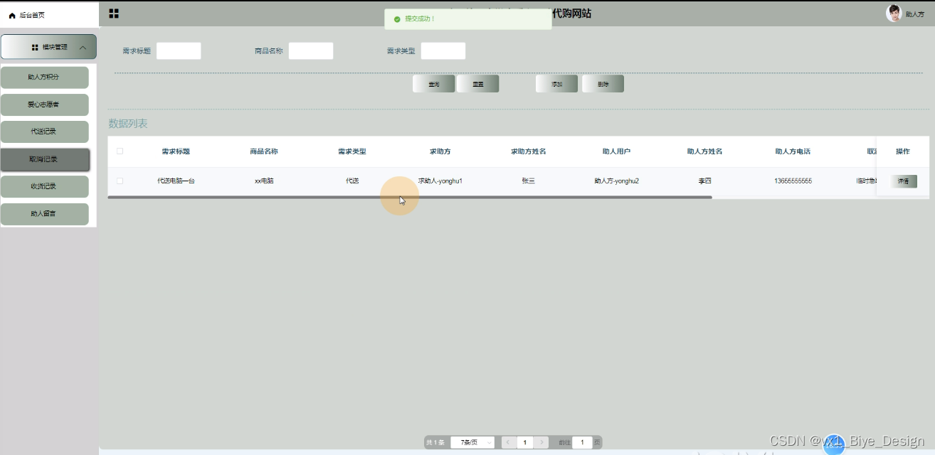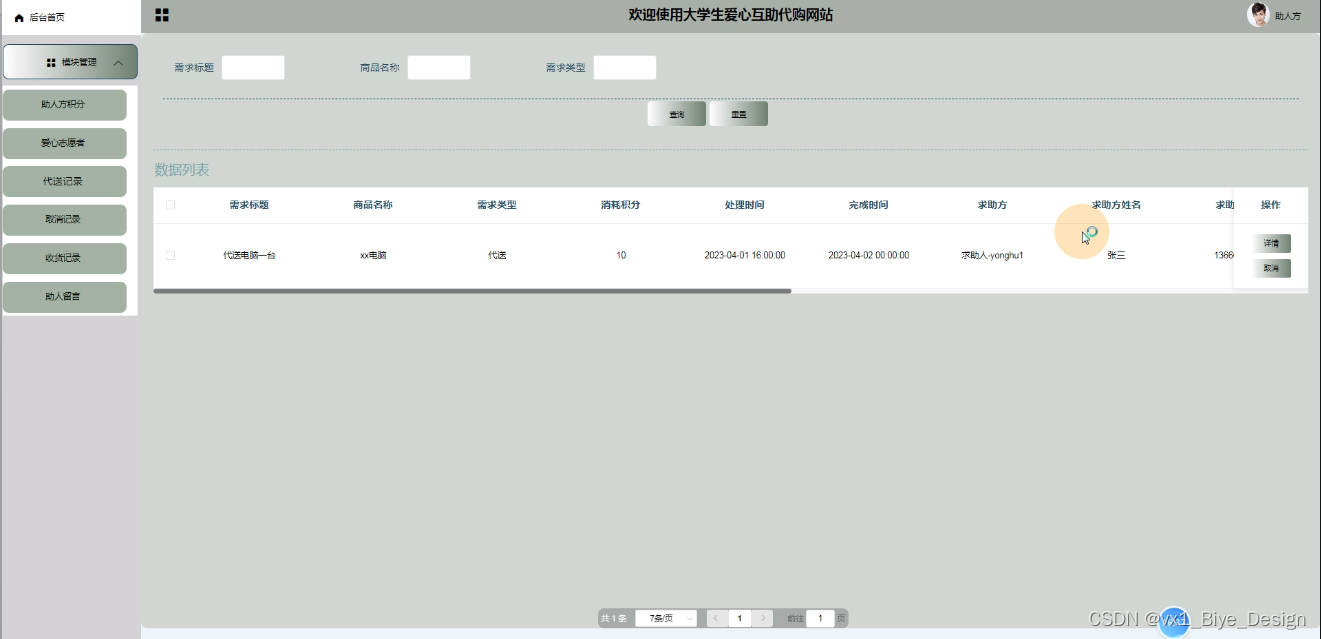 助人用户进入到代送记录管理界面可以查看需求标题、商品名称、需求类型、消耗积分、处理时间、完成时间、求助方、求助方姓名等信息,并可在该页面进行取消、查询、修改等操作,如图5-13所示。