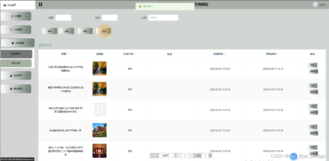 管理员进入校园资讯管理界面可以查看索引、标题、封面图、分类、标签等信息,并可在此页面进行详情、修改、查看评论等操作,如图5-7所示。