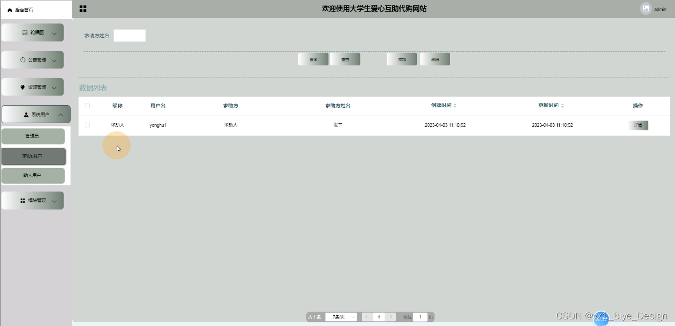管理员进入到界面,通过界面的任务大厅,登录成功后进入到系统可以进行查看首页、轮播图(轮播图管理)、公告管理(公告)、资源管理(校园资讯、资讯分类)、系统用户(管理员、求助用户、助人用户)、模块管理(求助方积分、助人方积分、积分申请、爱心志愿者、发放积分、需求信息、代送记录、取消记录、收货记录、求助留言、助人留言)等功能模块,进行相对应操作,如图5-5所示。