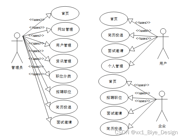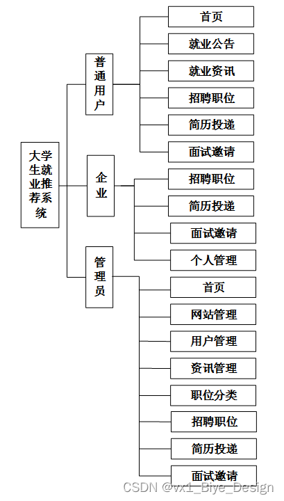 大学生就业推荐系统总体分为前台用户模块和后台、企业及管理员模块。