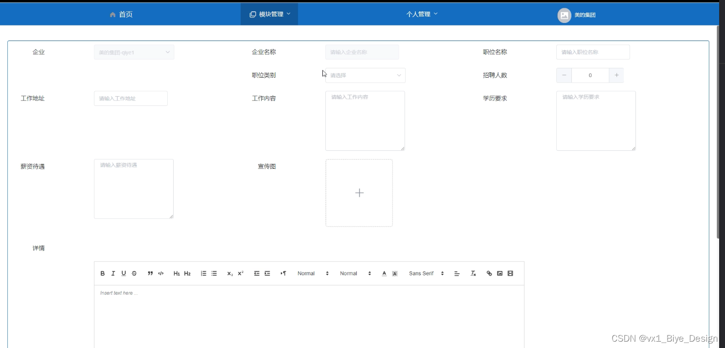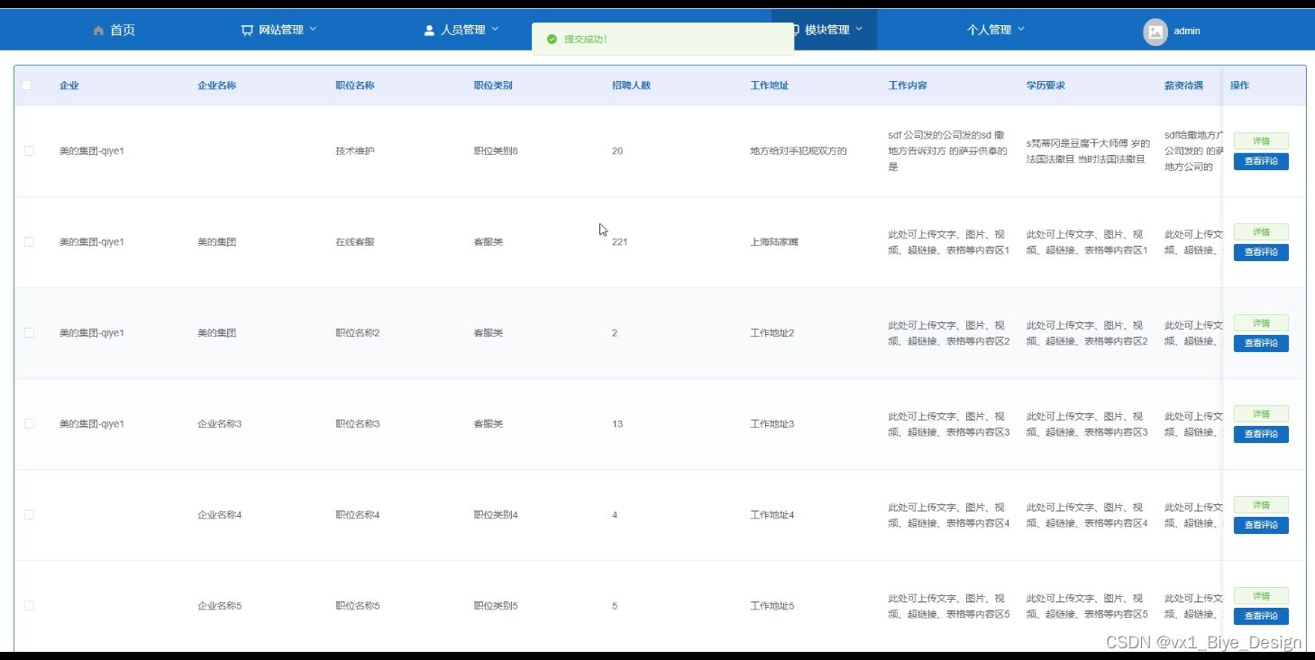 职位管理模块:职位管理分为职位添加、修改和简历投递。职位信息由管理员进行修改、添加、删除操作;简历投递由普通用户来执行。