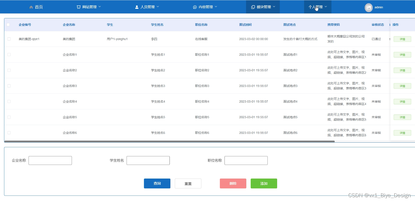 面试邀请数据模块:可分为面试邀请数据浏览、面试邀请数据检索、面试邀请数据维护三个模块,企业对面试邀请数据有维护的权限,发布新的面试邀请数据、更新已有的面试邀请数据等。