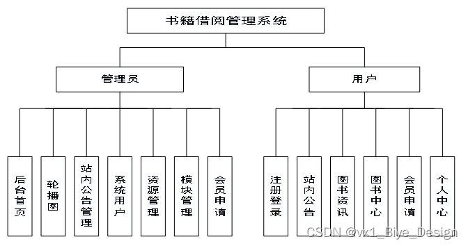 根据用户对系统的需求,要求系统简单操作,能够准确,完整的对信息进行管理。书籍借阅管理系统在对需求做解析后,整个系统主要分为两个部分:管理员和普通用户,每个模块下的分支功能不一样。对功能做出如下说明: