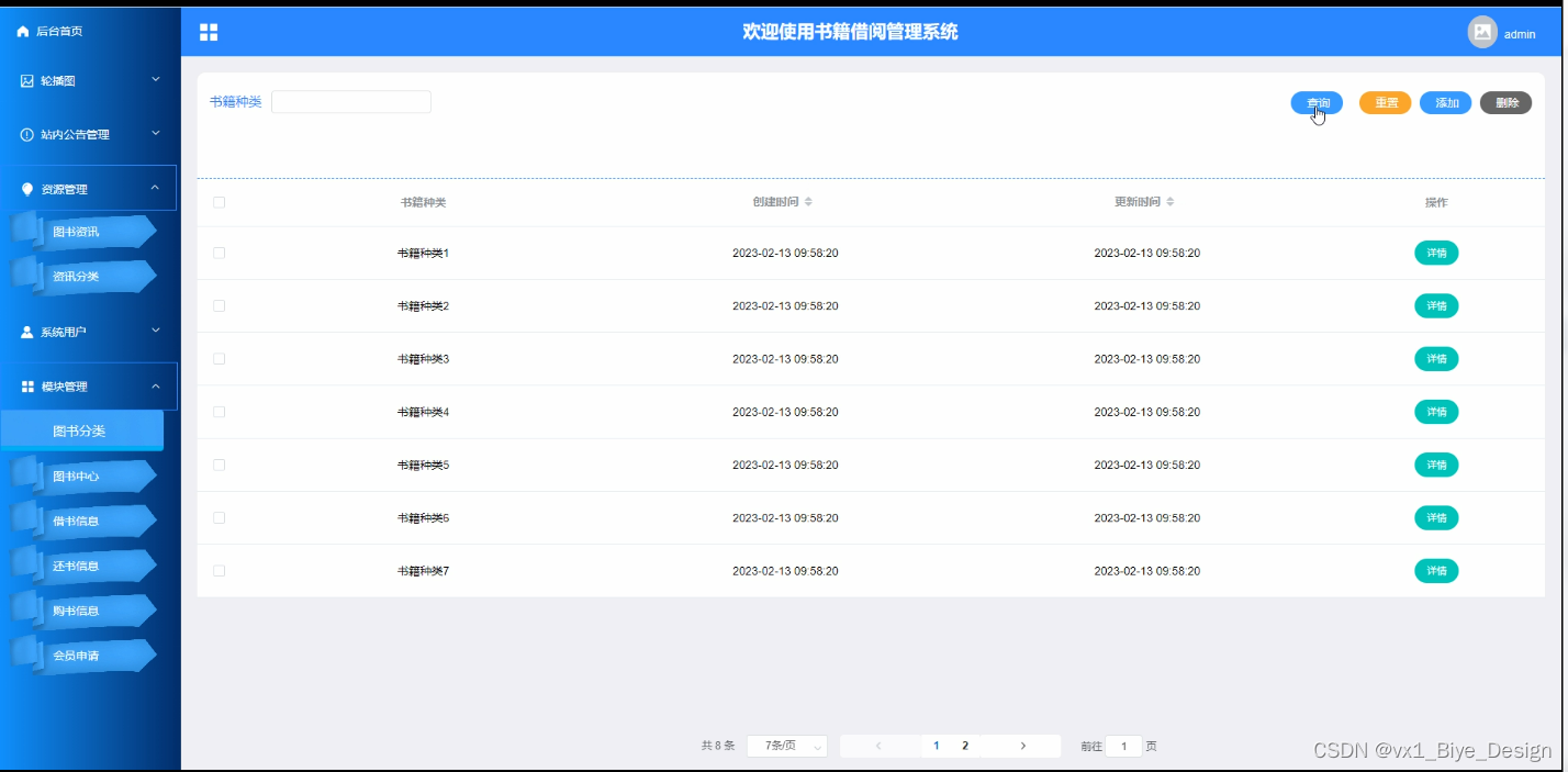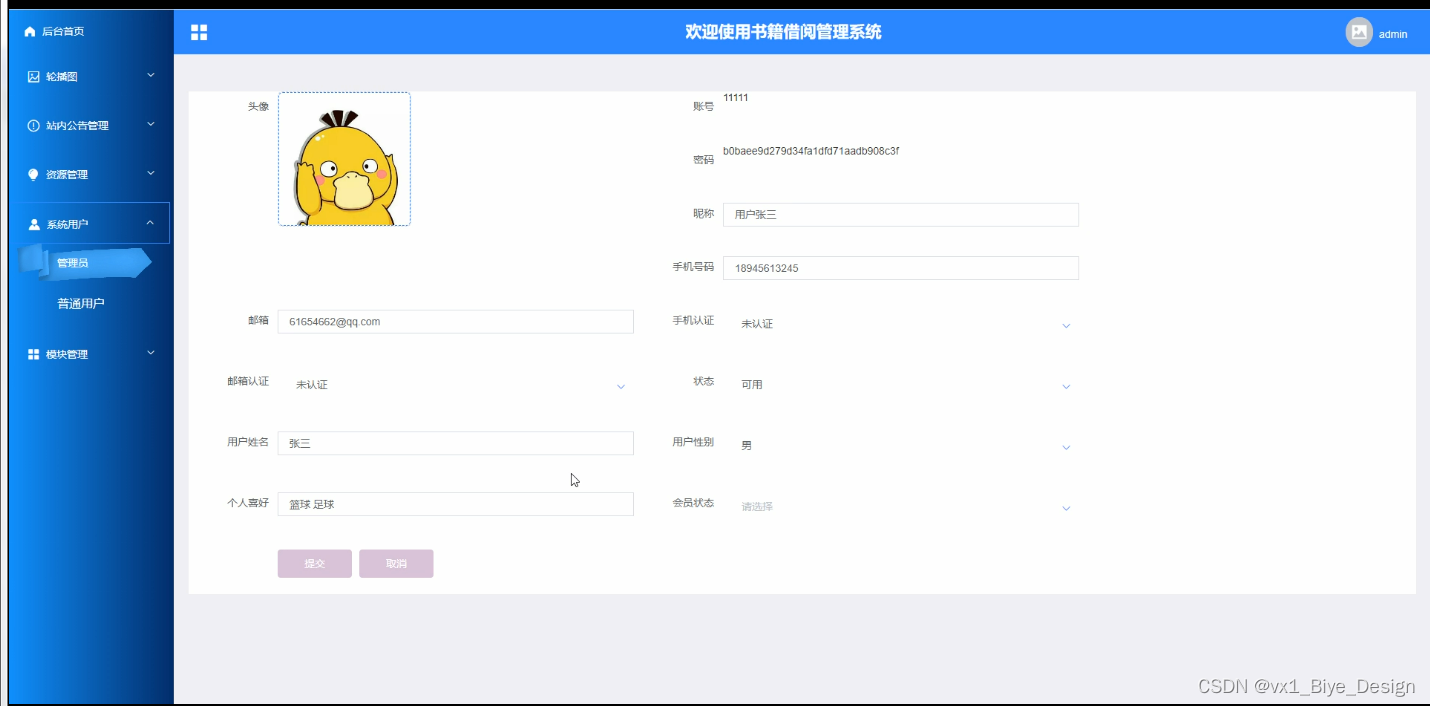 管理员模块:首页、轮播图、站内公告管理、用户管理(管理员、系统用户)资源管理(图书资讯、资讯分类)、模块管理(图书分类、图书中心、借书信息、还书信息、购书信息、会员申请)等功能模块。