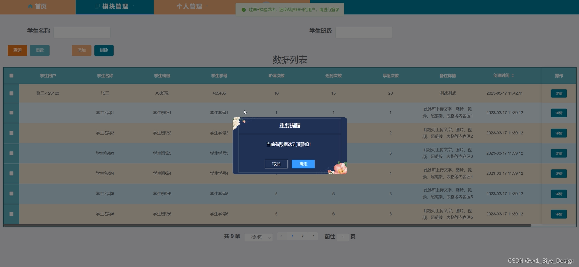 模块包括管理员:首页、人员管理(管理员、学生用户、教师用户)、权限管理(权限列表)、模块管理(班级管理、成绩管理、考勤信息、学分信息、挂科统计、公告栏、数据统计)、个人管理等进行相应的操作。