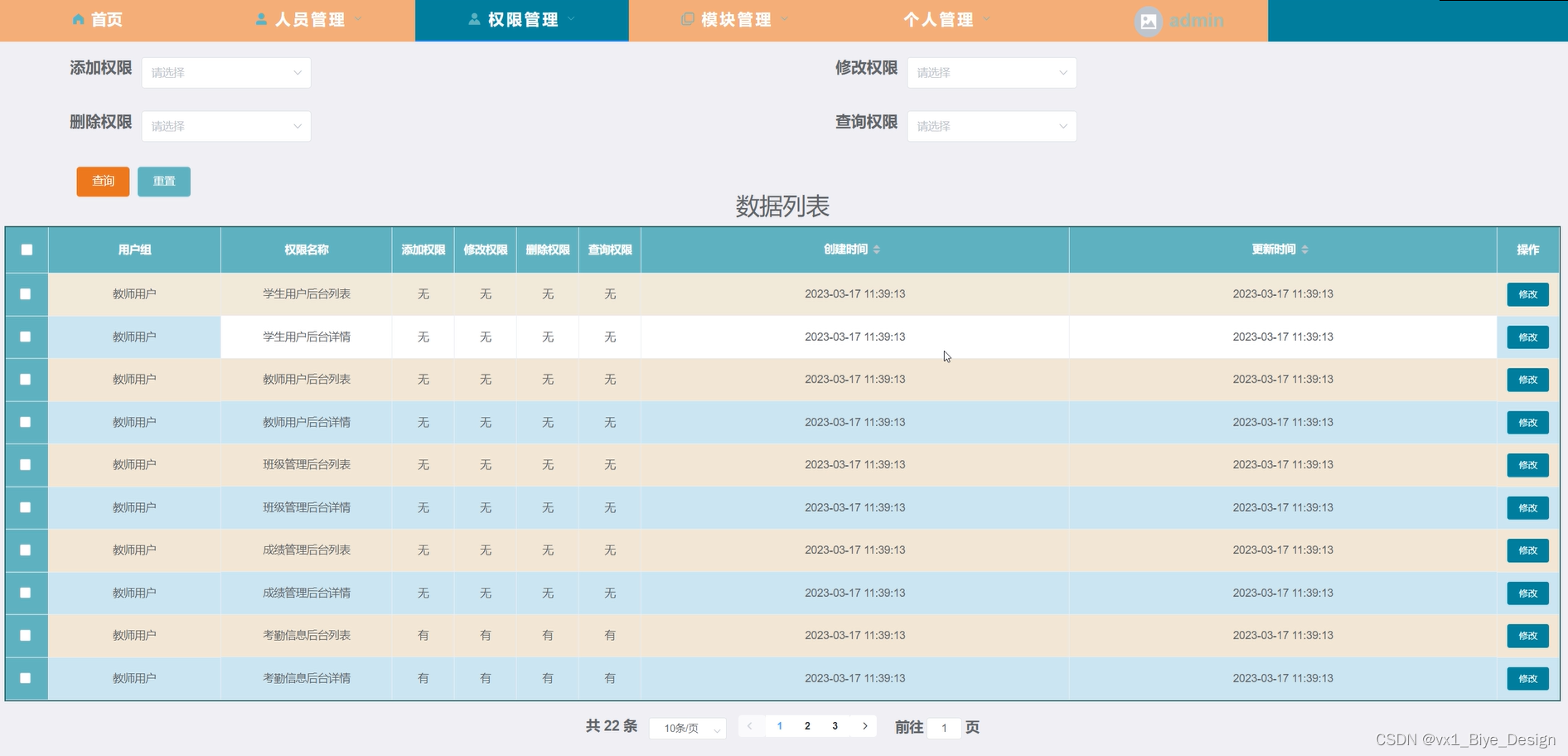 权限管理-权限设置,在此页面管理员可以查看权限,并进行查询,重置,删除,添加等操作,如图5-11,12所示。