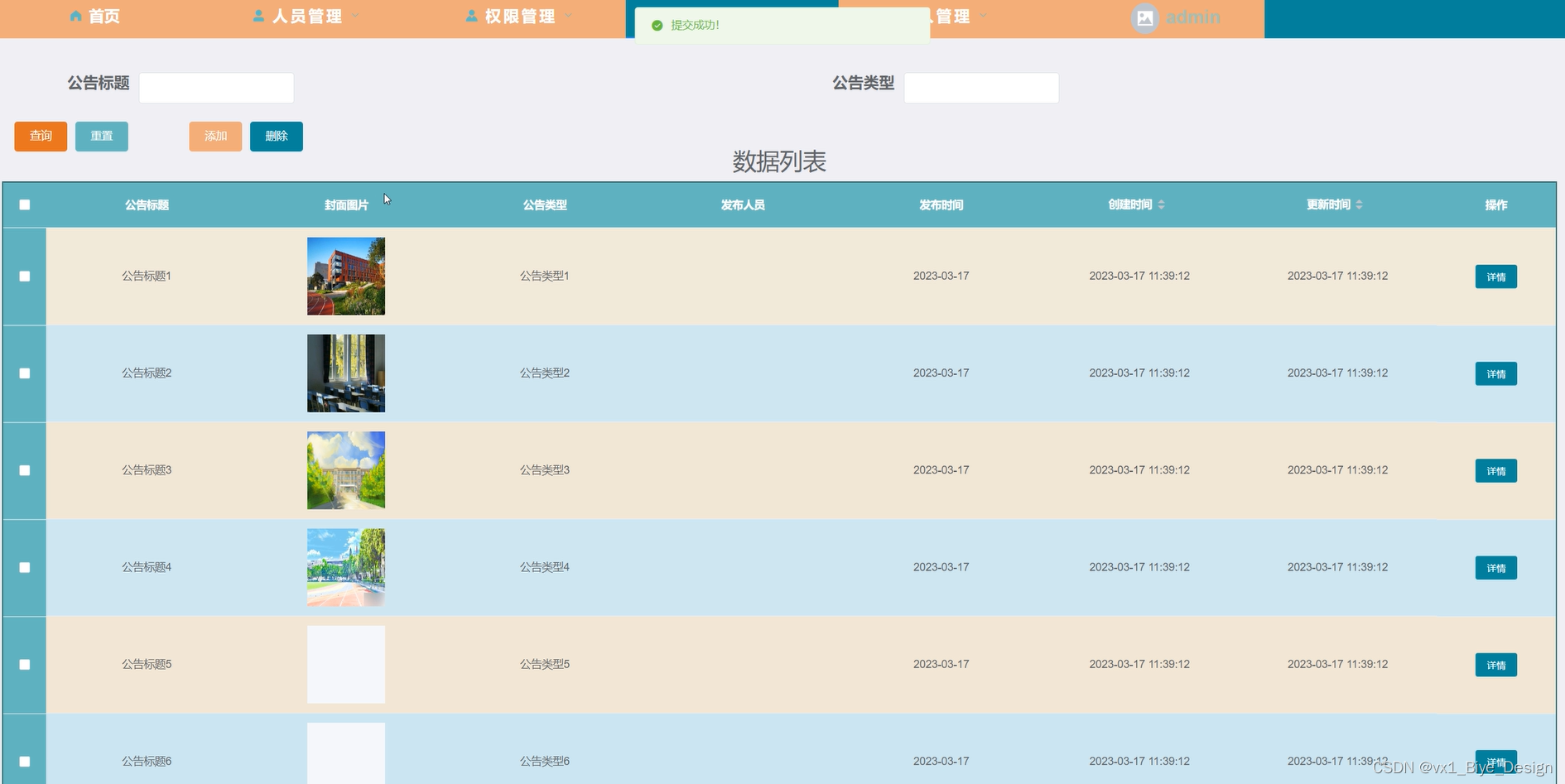 模块管理-公告栏,在此页面管理员可以查看公告标题、封面图片、公告类型等,可以查询,重置,删除,添加等操作,如图5-14,15所示。