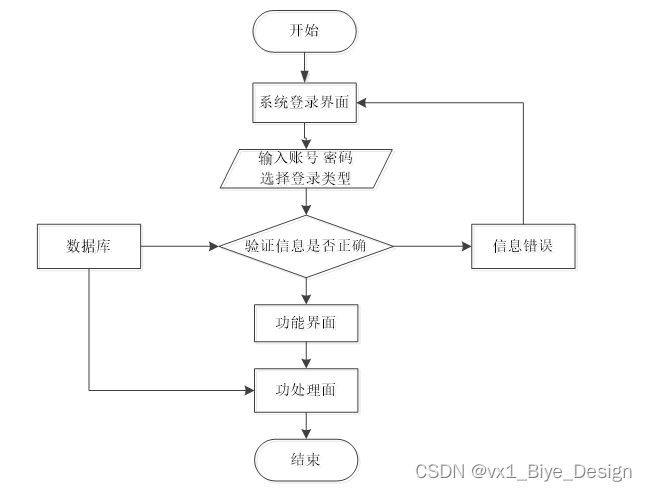 用户想进入系统,首先进入系统登录界面,通过正确的用户名、密码等信息,系统会检查登录信息,信息正确,然后输入相应的功能界面,提示信息错误,登录失败。系统操作流程如图3-2所示。
