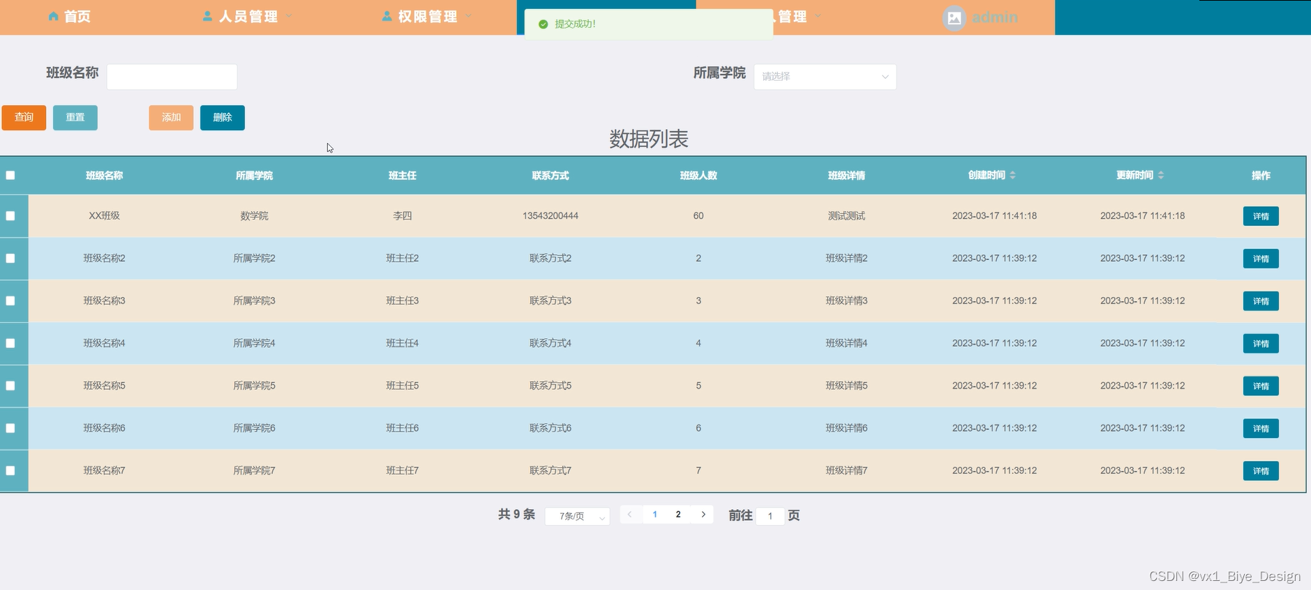 模块管理-班级管理,在此页面管理员可以查看班级名称、所属学院、班主任、班级人数等,可以查询,重置,删除,添加等操作,如图5-13所示。