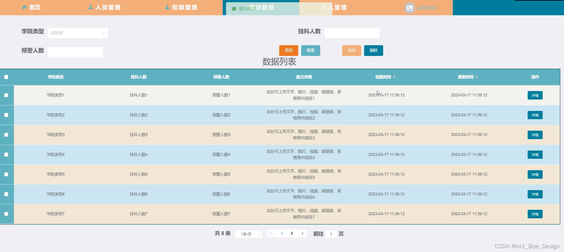 模块管理-数据统计,在此页面管理员可以查看学院类型、挂科人数、预警人数、备注详情等,可以查询,重置,删除,添加等操作,如图5-16所示。