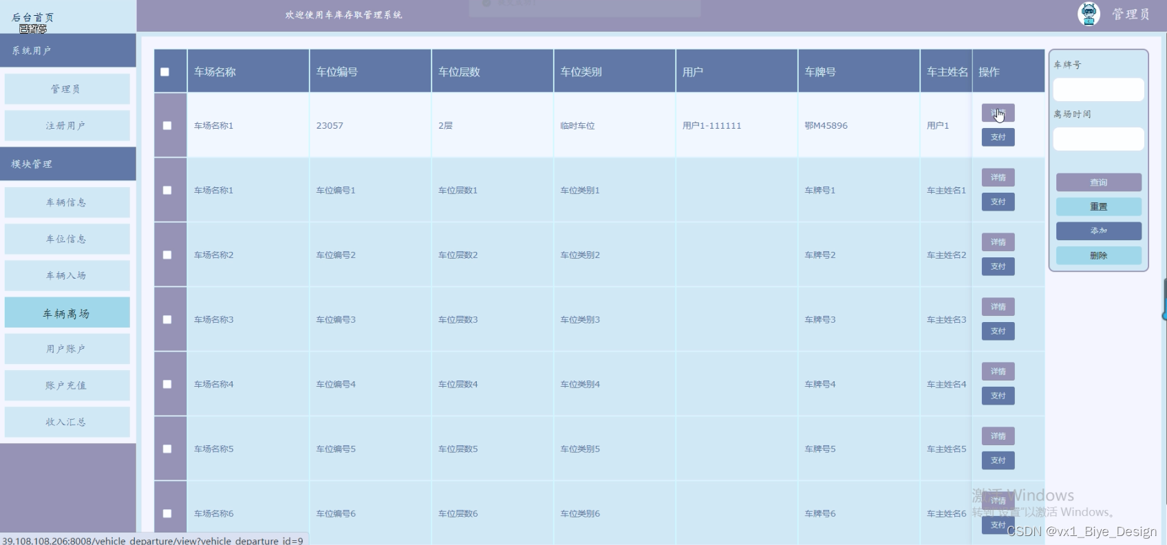 管理员点击“车辆离场”会显示出所有的车辆离场信息,支持输入车场名称或者车位编号对车辆离场信息进行查询,如果想要添加新的车辆离场信息,点击“添加”按钮,输入相关信息,点击“提交”按钮就可以添加了,同时可以选择某一条车辆离场信息,点击“删除”进行删除,也可以点击后面的“支付”按钮对车辆离场的支付信息进行设置。界面如下图4.8所示。