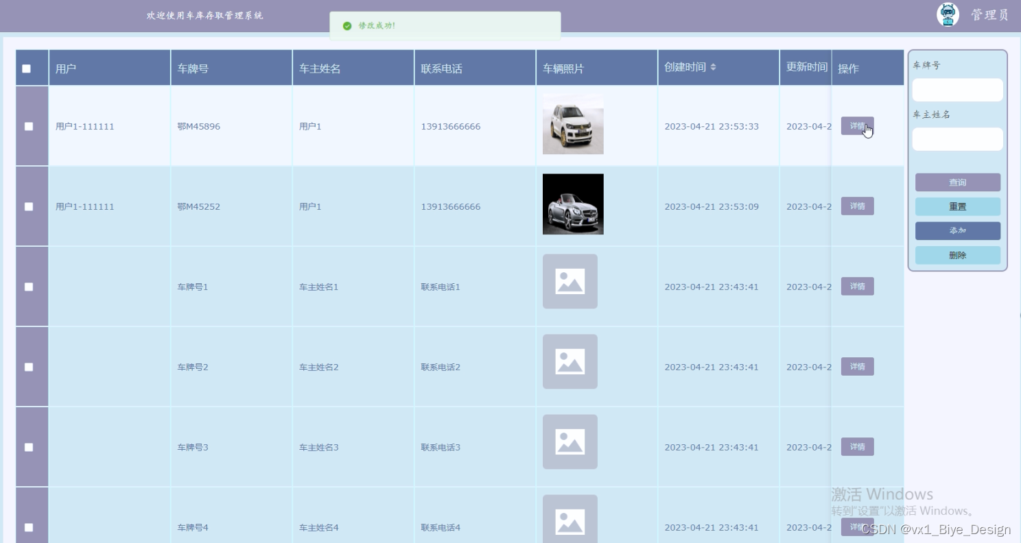 管理员和用户点击“车辆信息”这个按钮可以查看到系统中的车辆信息,支持通过用户或者车牌号或者车主姓名进行查询车辆信息,如果想要添加新的车辆信息,点击“添加”按钮然后根据提示输入车辆信息,点击“提交”后,在车辆信息界面就会显示新增的车辆信息,可以点击某一车辆信息查看车辆信息的详情,也可以直接点击“删除”进行删除车辆信息。界面如下图4.6所示。