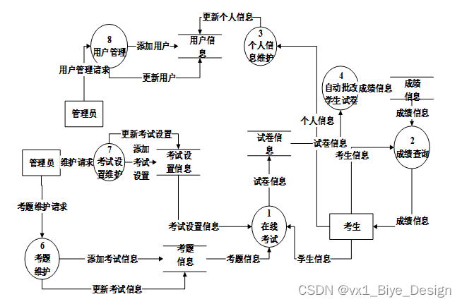 对系统的数据流进行分析,系统的使用者分为二类,考生用户,管理员。系统主要对界面信息传送,登录信息的验证,注册信息的接收,用户各种操作的响应做处理。