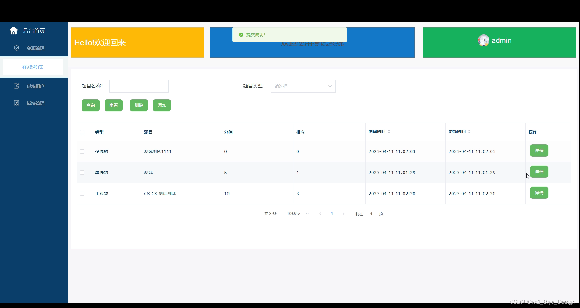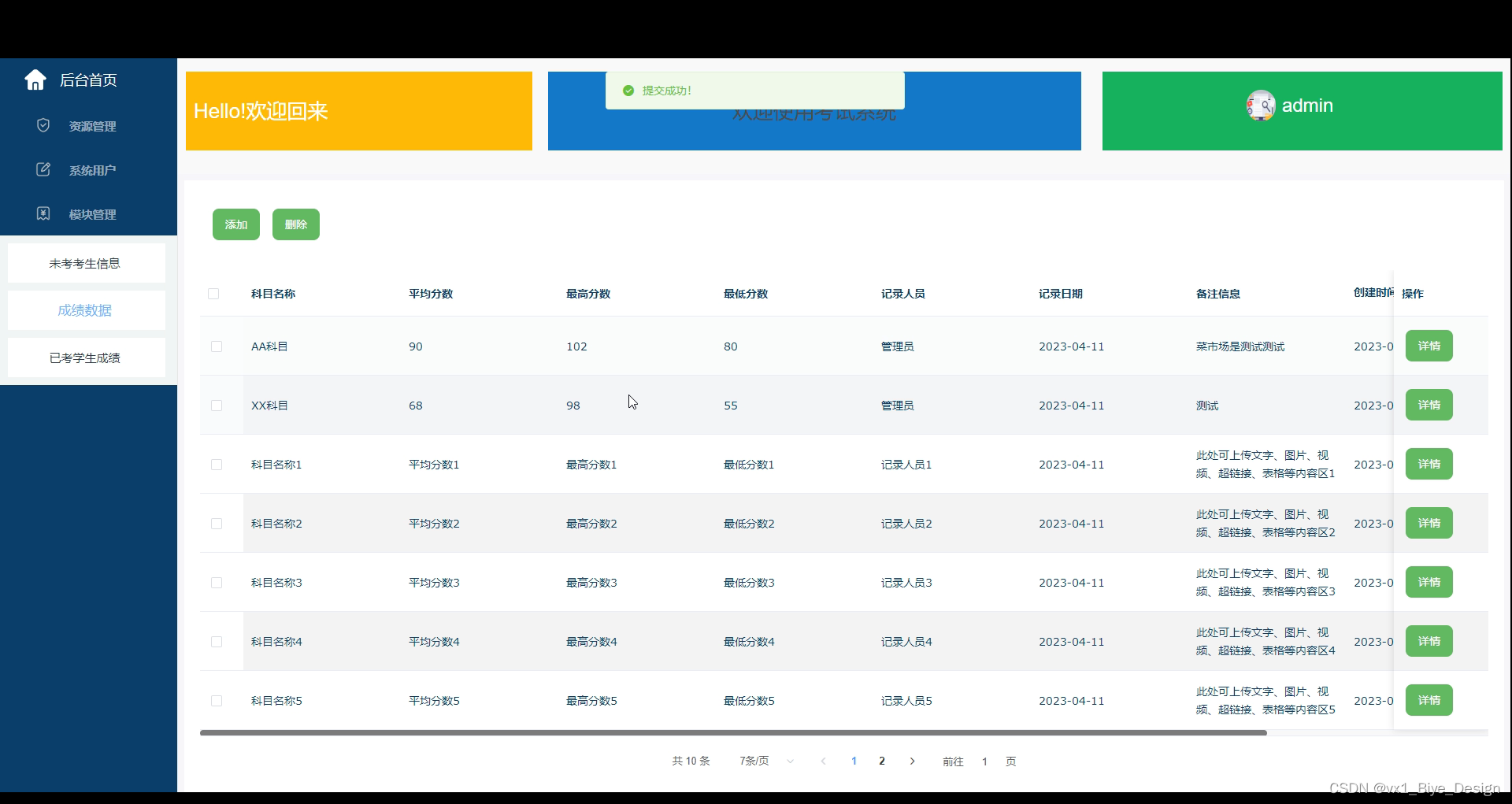 | 点击删除考试信息,选择考试信息删除 | 提示删除成功 | 与预期结果一致 |