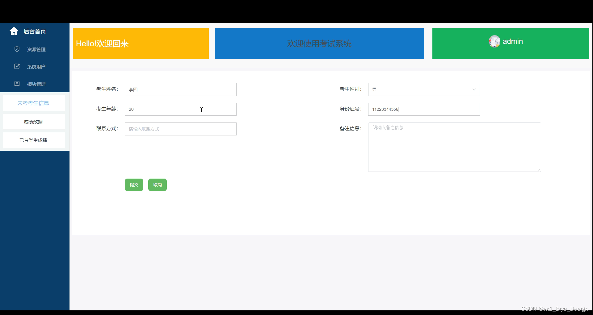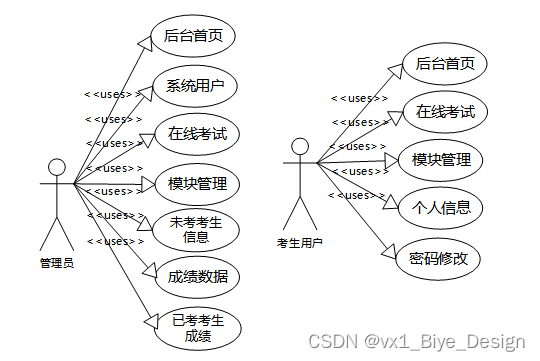 考试系统的主要使用者分为管理员和考生用户,实现功能包括后台首页,在线考试,系统用户(管理员,考生用户),模块管理(未考考生信息,成绩数据,已考考生成绩)等功能。