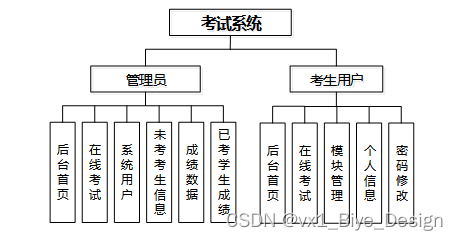 考试系统总体分为考生用户模块和管理员模块。