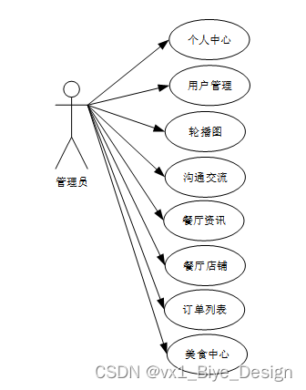 管理员模块:首页、个人资料、轮播图、用户管理、沟通交流、交流分类、餐厅资讯、资讯分类、餐厅店铺、订单列表、分类列表、美食中心。