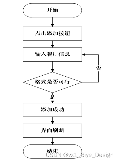餐厅管理包括新增餐厅、删除餐厅、修改餐厅、查询餐厅等,以餐厅新增为例,在视图层请求餐厅信息新增,反馈后,调用业务逻辑层,通过业务逻辑层的接口调用底层的数据逻辑层完成数据库联动操作。
