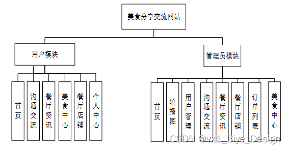 根据用户对系统的需求,要求系统简单操作,能够准确,完整的对信息进行管理。美食分享交流网站在对需求做解析后,整个系统主要分为两个部分:管理员和普通用户,每个模块下的分支功能不一样。对功能做出如下说明: