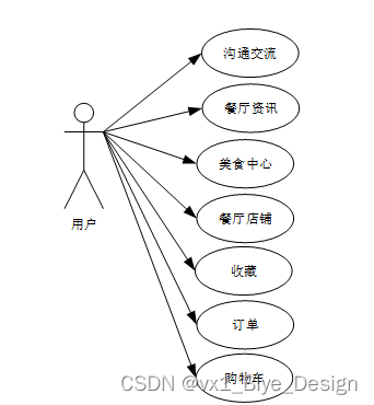 用户模块:首页、沟通交流、餐厅资讯、美食中心、餐厅店铺、我的(个人资料、密码修改、收货地址、收藏、订单、购物车)。
