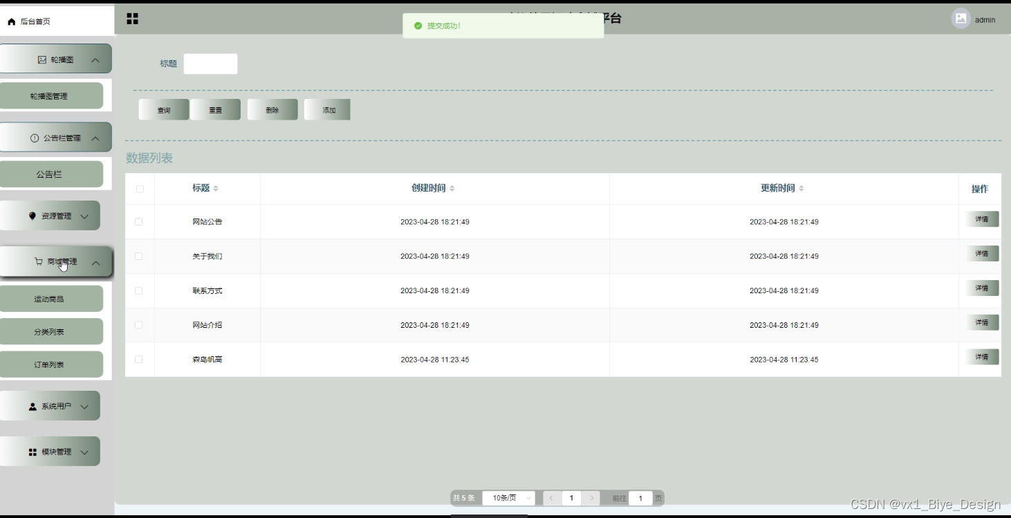 (1)轮播图:点击“轮播图”可以查看到系统中的轮播图信息,如果想要添加新的轮播图,点击“添加”按钮,根据提示输入上轮播图信息,点击“提交”按钮,信息没有错误的话,添加就完成了,如果轮播图信息有误,可以对轮播图更新维护,也可以直接删除某一轮播图。