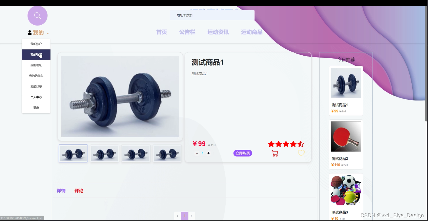 (5)运动商品详情:用户可以点击搜索查看自己喜欢的运动产品,点击可以进入到运动产品的详细界面当中,在详情界面可以查看运动产品的各种参数,对喜欢的运动产品可以加购、立即购买、收藏、评论。