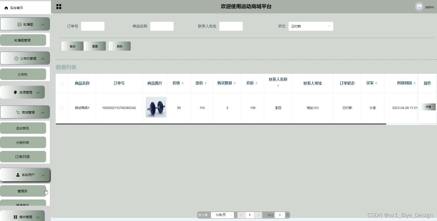 管理员拥有对运动商城中的商品进行添加、修改、删除、管理评论的功能,运动商城界面如下图4-12所示。